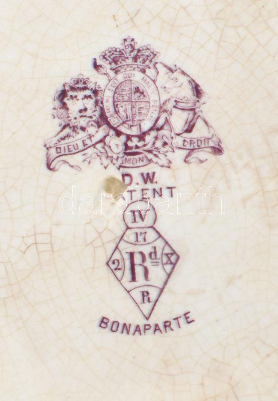 Leírás: DW fajansz dísztányér, Napóleon arcképével. Máz alatti festés, jelzett, hátul kis lepattanással d: 27 cm