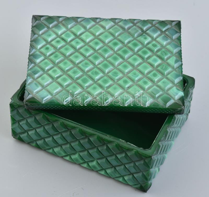 Leírás: Cseh malachit üveg ékszertartó doboz, 1930 körül, jelzés nélkül, 12x9x5,5 cm