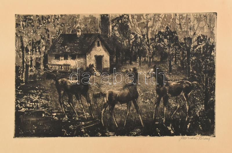 Leírás: Bordás Ferenc (1911-1982): Csikók. Rézkarc, papír, jelzett, lap széle kissé foltos, 24×39 cm