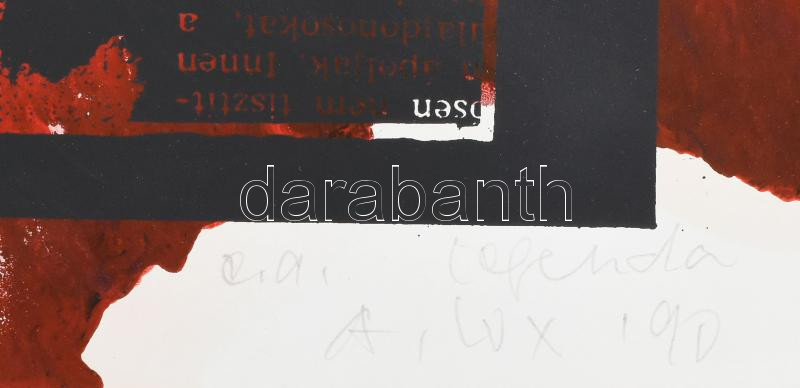 Leírás: Lux Antal (1935-): Legenda, 1990. Színes szitanyomat, monotípia, papír. Jelzett. Művészpéldány e.a. jelzéssel. 35x50 cm.