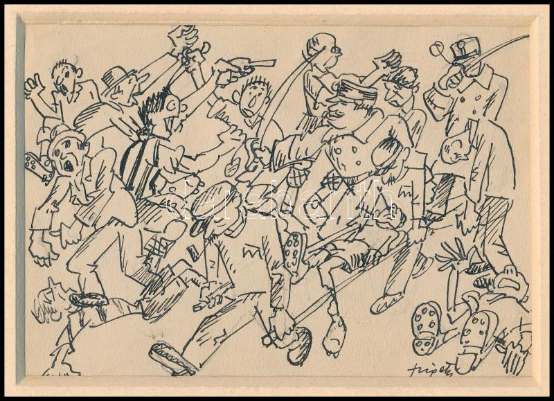 Leírás: Szigety István: Merénylet karikatúra. Tus, papír, sérült paszpartuval, jelzett, 10,5x14,5 cm