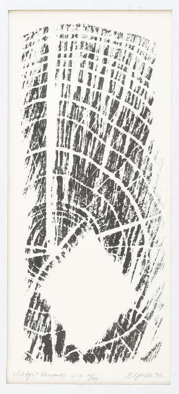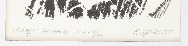 Leírás: Zubovits Győrkös Erzsébet (?-): "Ősi jel I.". Fanyomat, papír, jelzett, művészpéldány E.A. III/VII. számozással. Hátoldalán autográf felirattal. Paszpartuban. 23x9,5 cm.