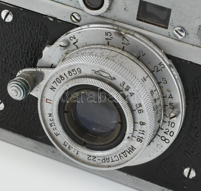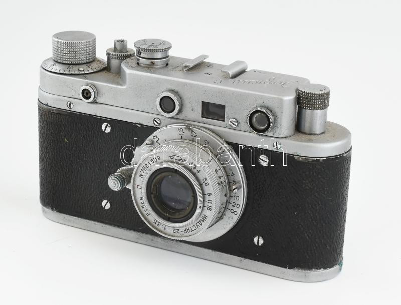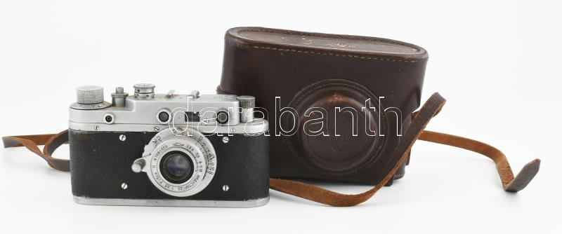 cca 1950 Zorkij-3 szovjet fényképezőgép, Industar-22 1:3,5 f=50 mm objektívvel, eredeti, bőr tokjában / Vintage USSR rangefinder camera, in original, slightly worn leather case