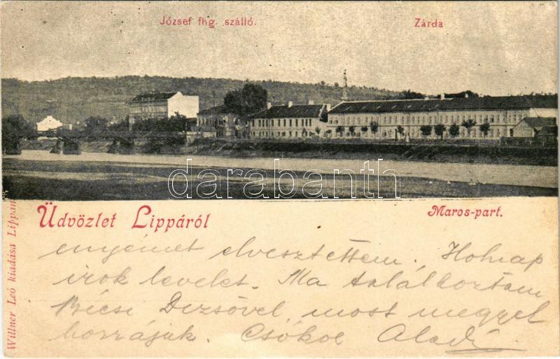 Leírás: 1899 (Vorläufer) Lippa, Lipova; József főherceg szálloda, zárda, Maros-part. Willner Leó kiadása / hotel, nunnery, Mures-riverside