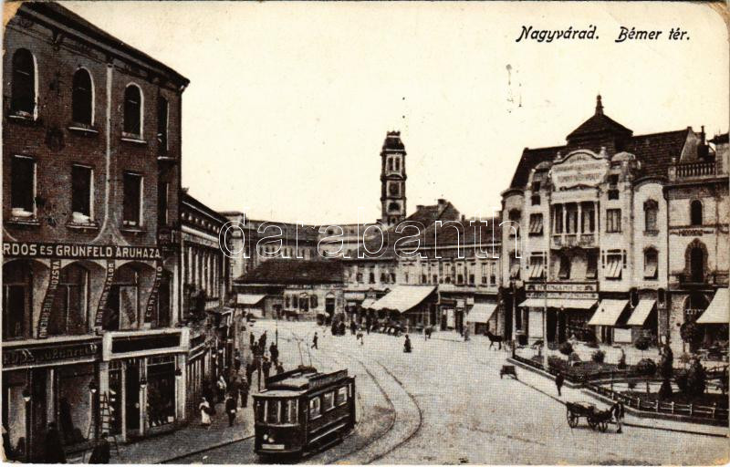 1913 Nagyvárad, Oradea; Bémer tér, villamos, Erdős és Grünfeld üzlete ... https://www.darabanth.com/hu/436-Gyorsarveres/436.0/Kepeslapok/Erdely~2000005/1913-Nagyvarad-Oradea-Bemer-ter-villamos-Erdos-es-Grunfeld-uzlete-square-tram-shops-~II2781184