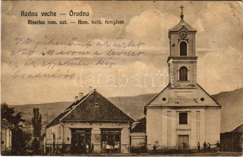 Leírás: 1913 Óradna, Alt-Rodna, Radna veche, Rodna; Római katolikus templom, M. Bányay, Mihail Taucner üzlete. Bányay Károlyné kiadása / Catholic church, shops (fa)