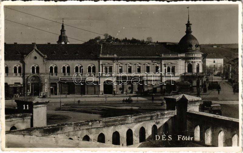 1941 Dés, Dej; Fő tér, Gyógyszertár, patika, Salamon Jakab, Bíró, Wolf, Heinovits Ferenc, Jónás Elemér üzlete, automobil / main square, pharmacy, shops, automobile