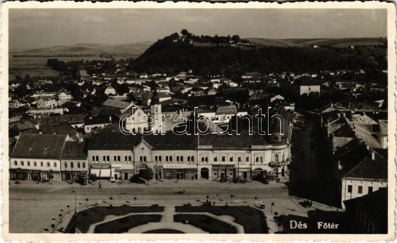 Leírás: 1943 Dés, Dej; Fő tér, Hangya Szövetkezet, Bíró, Wolf üzlete, gyógyszertár / main square, shops, pharmacy