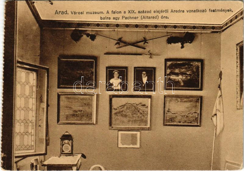 Arad, Városi múzeum, a falon a XIX. század elejéről Aradra vonatkozó festmények, balra egy Pachner (Altarad) óra, belső. Kerpel Izsó kiadása / museum interior