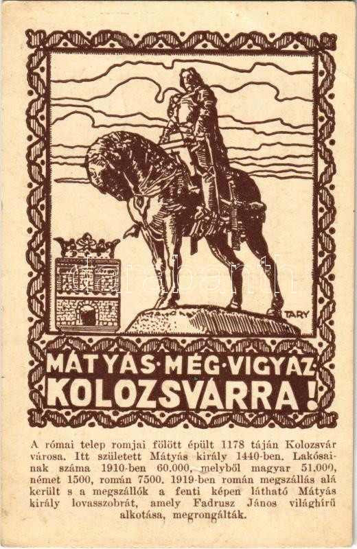 Leírás: Kolozsvár, Cluj; Mátyás még vigyáz Kolozsvárra! irredenta képeslap Mátyás király szoborral. Közművelődési rt. kiadása / Hungarian irredenta propaganda, monument s: Tary (EB)