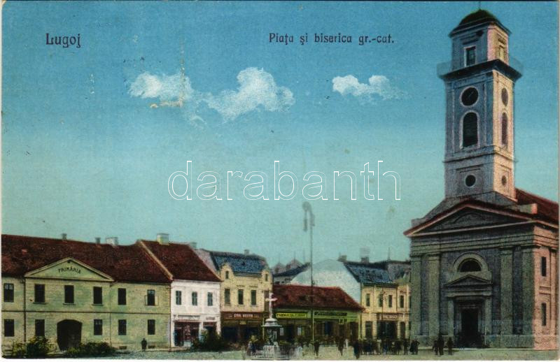Lugos, Lugoj; Piata si biserica gr.-cat. / Városháza, templom, gyógyszertár, Alexandru Csizmás, Emil Reiter, Emanuel Karman üzlete / town hall, church, pharmacy, shops