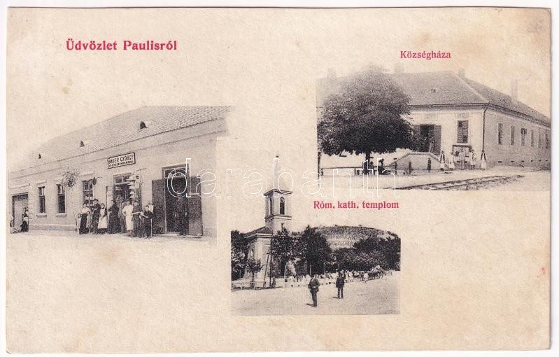 Ópálos, Ópaulis, Paulis (Arad-Hegyalja); Községháza, Római katolikus templom, Bauer György üzlete és saját kiadása / town hall, Catholic church, publisher's shop (r)