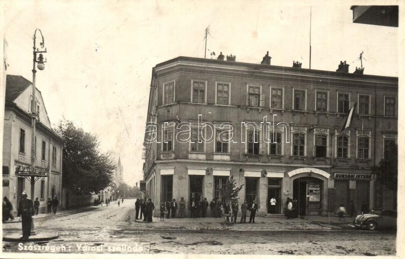 Leírás: Szászrégen, Reghin; Városi szálloda, Kunsági István üzlete, magyar zászló, automobil / hotel, shops, Hungarian flag, automobile (felületi sérülés / surface damage)