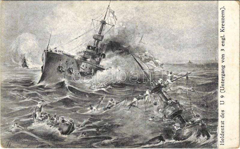 1915 Heldentat des U 9: Untergang von 3 engl. Kreuzern / Az "U-9" hőstette. Három angol cirkáló süllyedése / WWI Imperial German Navy (Kaiserliche Marine) art postcard, submarine "U-9" sinks 3 English cruisers. B.K.W.I. 259-26. s: Harry Heusser