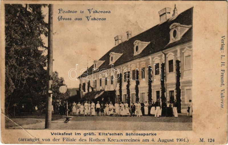 1901 Vukovar, Volksfest im gräfl. Eltz'schen Schlossparke, arrangirt von der Filiale des Rothen Kreuzvereines am 4. August 1901. / Ünnepség a grófi kastély udvarán, melyet a Vörös Kereszt Egylet fiókja rendezett / folk festival in castle park, arranged by the branch of the Red Cross Association (EB)
