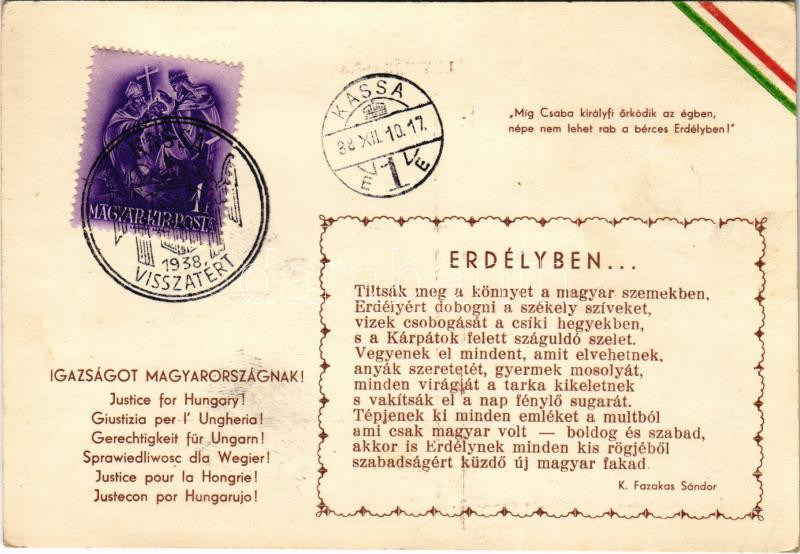 Igazságot Magyarországnak! Míg Csaba királyfi őrködik az égben, népe nem lehet rab a bérces Erdélyben! / Justice for Hungary! Hungarian irredenta propaganda with Hungarian flag decoration + "1938 Kassa visszatért" So. Stpl. (EK)