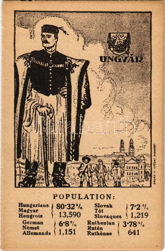 Ungvár, Uzshorod, Uzhorod; Magyar, német, tót (szlovák) és rutén (ruszin) nemzetiségek népesség aránya. Címer, Grund V. Utódai, Magyar Nemzeti Szövetség kiadása / Percentage of Hungarian, German, Slovakian and Ruthen (Rusyn) population. Irredenta art postcad with coat of arms s: Pólya Tibor
