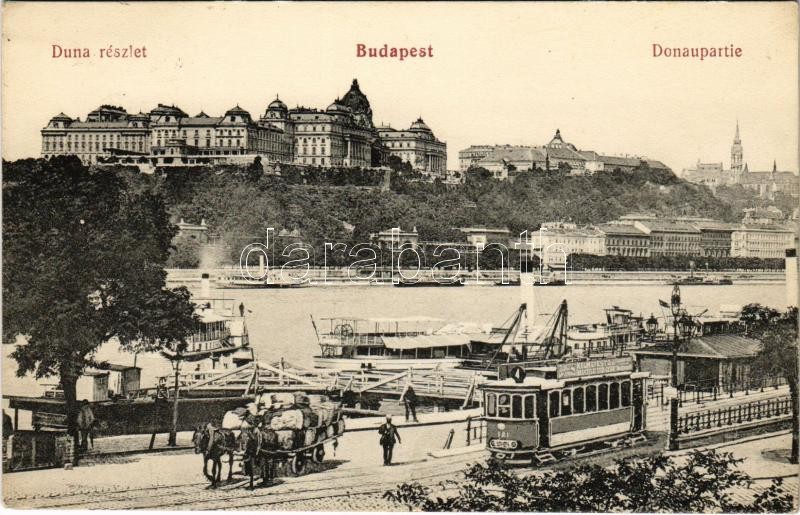 Leírás: 1913 Budapest V. Dunai rakpart, 4-es villamos Berkecz István kelmefestő és vegytisztító reklámja, lovaskocsi, Királyi vár