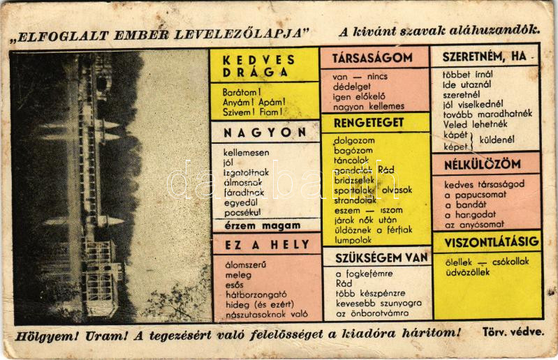 Leírás: 1942 Hévíz. Elfoglalt ember levelezőlapja (fa)