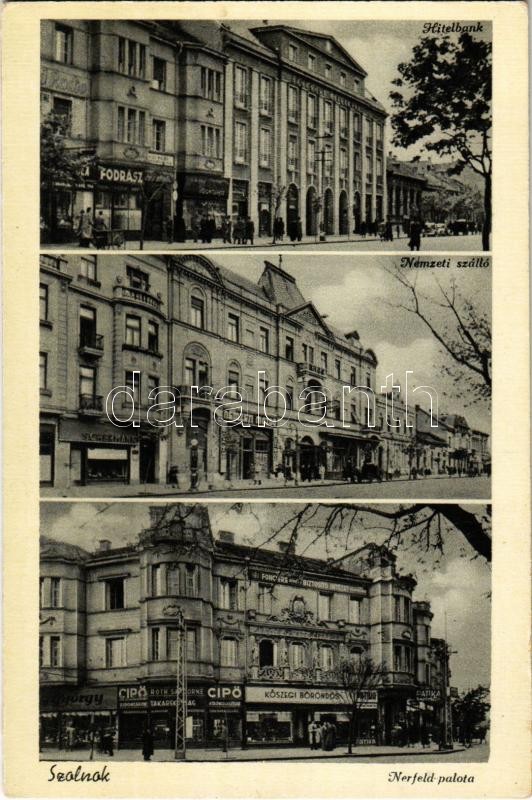 Szolnok, Hitelbank, fodrászat, automobilok, Nemzeti szálloda, Nemzeti Mozgó (mozi), Schermann, Róth Sándorné üzlete, Kőszegi Bőröndös, patika, gyógyszertár, Nerfeld palota, Fonciere biztosító