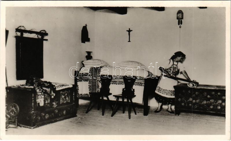 Leírás: Tihany, A M. Kir. Balatoni Intéző Bizottság Balatonkörnyéki Népművészeti Háza, belső, tiszta szoba