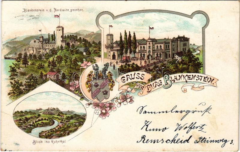 1899 (Vorläufer) Hattingen, Burg Blankenstein v. d. Nordseite gesehen, Blick ins Ruhrthal / castle, valley, coat of arms. Art Nouveau, floral, litho (fa)