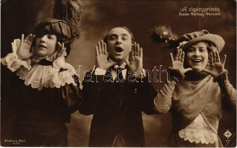 Leírás: A cigányprímás: Fedák, Rátkay és Perczell. Strtelisky Bpst 1913. (EK)