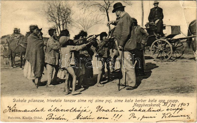 Nagybecskerek, Zrenjanin, Veliki Beckerek; cigányok főúrral; roma nyelvű szöveggel. Felvette és kiadja Oldal / Dakala pilanzse, trivetala tanzse sime roj some poj, sime kala berber kala opp czupp / gypsy children with noble man. Romany text (szakadás / tear)