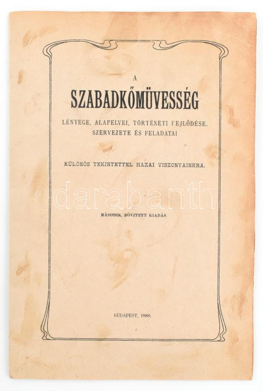 A szabadkÅ‘művesség lényege, alapelvei, történeti fejlÅ‘dése. Szervezete és feladatai. Különös tekintettel hazai viszonyainkra. Bp., 1888., [Aigner Lajos], 32 p. Második kiadás. Szecessziós papÃrkötésben, foltos borÃtóval, szakadozott lapokkal, intézményi bélyegzésekkel, aláhúzásokkal.