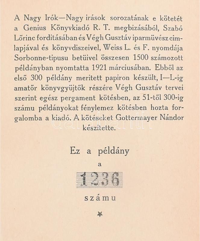 Shakespeare szonettjei. Ford.: Szabó Lőrinc. Nagy Írók - Nagy Írások IX. Bp.,1921., Genius. Átkötött álbordás félbőr-kötésben, kopott borítóval, sérült, részben hiányos gerinccel. Számozott (1236./1500) példány.