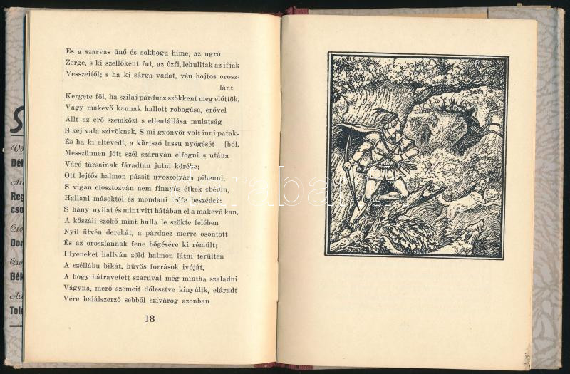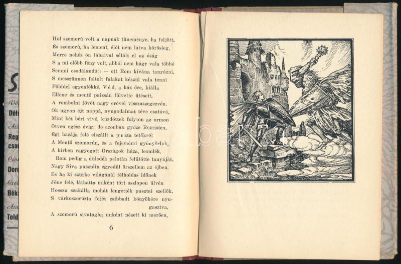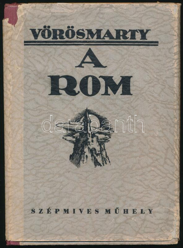 Vörösmarty (Mihály): A rom. A díszítő rajzok Haranghy Jenő munkái. Magyar Klasszikusok I. Bp., [1946.], Szépmíves Műhely, (Stílus-ny.), 30 p.+10 (fekete-fehér egészoldalas képtáblák) t. Kiadói kissé kopott félvászon-kötés, kiadói javított, kissé hiányos, kissé kopott papír védőborítóban, belül, a hátsó kötéstábla mentén sérüléssel.