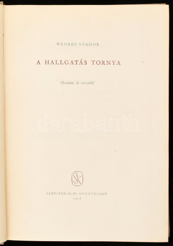 Weöres Sándor: A hallgatás tornya. harminc év verseiből. 1956, Szépiro... https://www.darabanth.com/hu/436-Gyorsarveres/436.0/Konyvek/Konyvek-Egyeb-ritkasagok~1000023/Weores-Sandor-A-hallgatas-tornya-harminc-ev-verseibol-1956-Szepirodalmi-Kiadoi-egeszva~II2827906