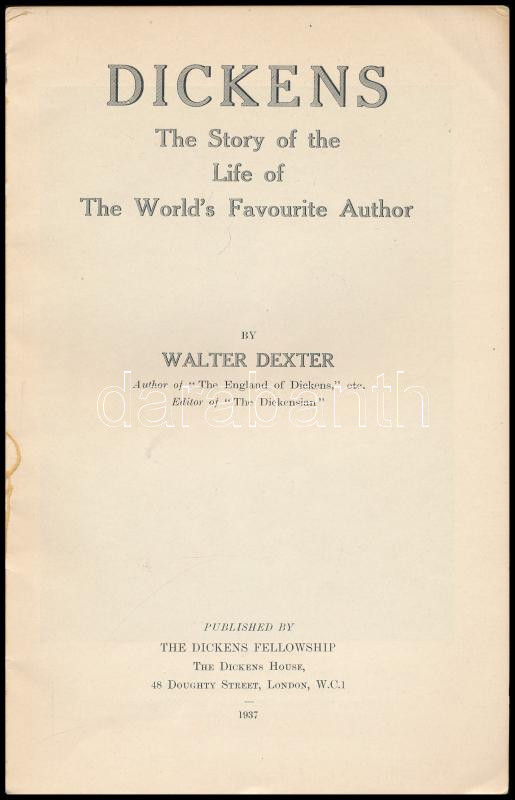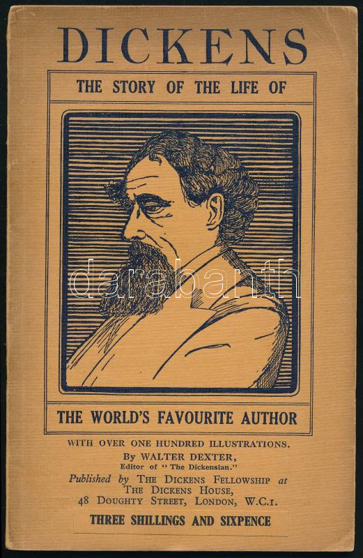 Walter Dexter: Dickens. The story of the life of the world's favorite author. London, 1937., The Dickens Fellowship. Fekete-fehér fotókkal illusztrált. Kiadói papírkötés, a gerincen kis hiánnyal,