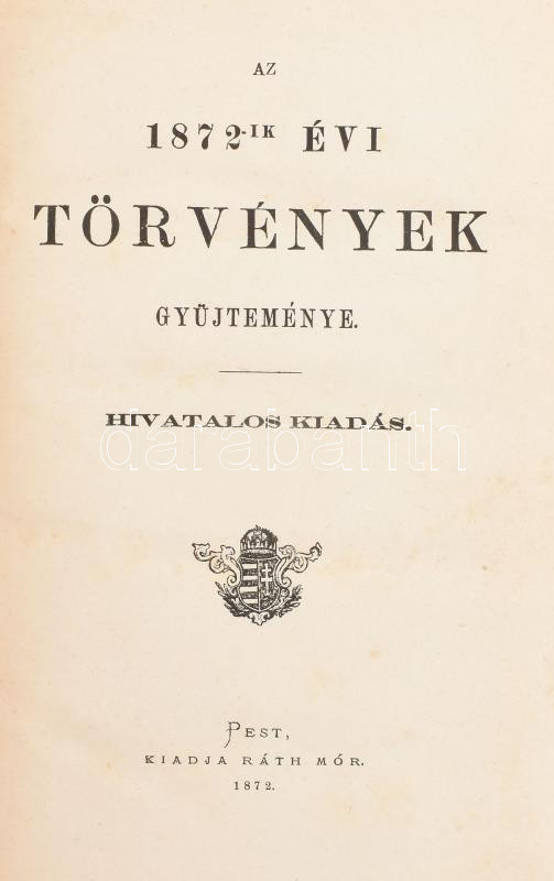 Az 1872-ik évi törvények gyűjteménye. Pest, 1872., Ráth Mór, 4+286+3 p. Első kiadás. Benne katonai, vadászati és más törvényekkel. Kiadói aranyozott egészvászon-kötés, az elülső táblán aranyozott, koronás nemzeti kiscímerrel, Reichenstein V.-kötés, a borítón kopásnyomokkal, a gerincen kis címkenyomokkal, néhány foltos lappal, régi vármegyei bélyegzéssel.