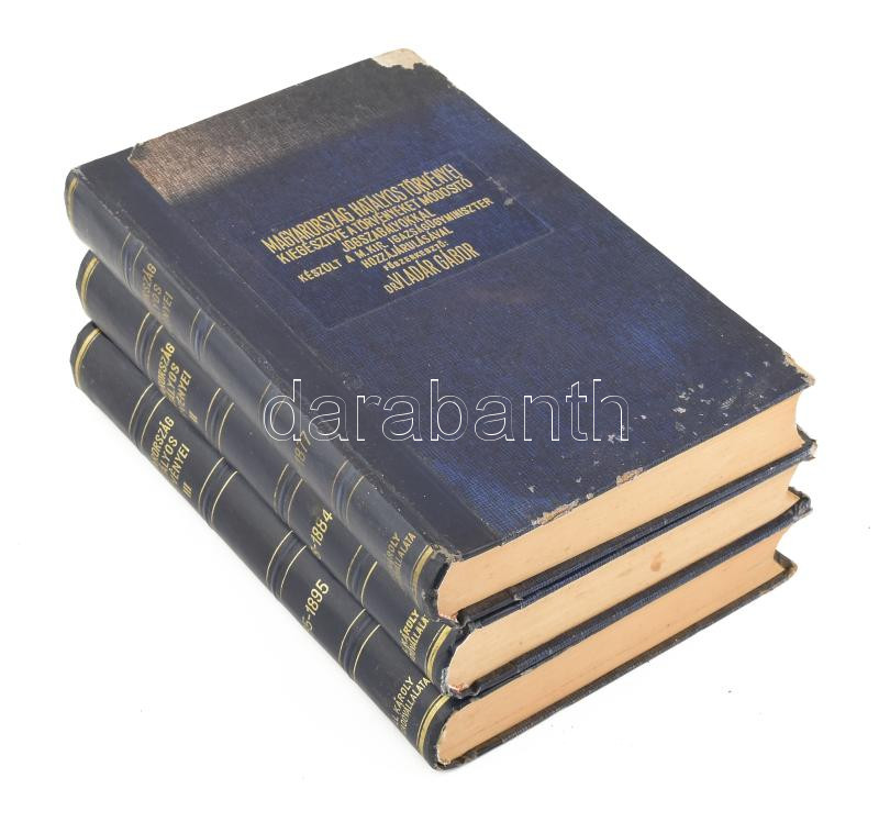 Leírás: Vladár Gábor: Magyarország hatályos törvényei kiegészítve a hatályos törvényeket módosító jogszabályokkal I-III. köt. I. köt.: 1000-1877. II. köt.: 1878-1884. III. köt.: 1885-1895. Főszerk.: Dr. - -. Bp., 1943., Grill, XVI+672; VII+723; VII+733 p. Kiadói aranyozott félbőr-kötés, kopott borítókkal.