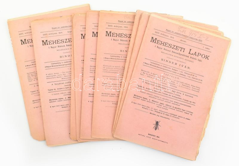 Leírás: 1914 Méhészeti Lapok. XXVI. évf. 1-11. számok. Majdnem teljes évfolyam. Szerk.: Binder Iván. Egy szám az alsó sarkán kissé sérült,