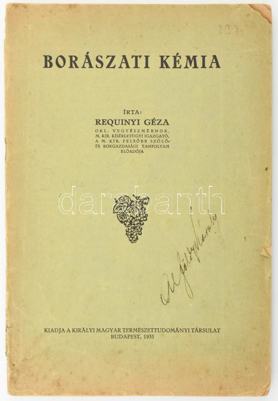 Requinyi Géza: Borászati kémia. Bp., 1935., Kir. M. Természettudományi Társulat, 100 p. Kiadói papírkötés, kissé foltos, kissé szakadt borítóval, a gerincen hiánnyal, névbejegyzéssel.