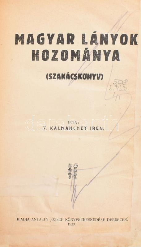 Leírás: T. Kálmánchey Irén: Magyar lányok hozománya. (Szakácskönyv.) Debrecen, 1930., Antalfy József-ny., 275 p. Átkötött egészvászon-kötés, kopott borítóval, foltos lapokkal, ceruzás firkákkal.