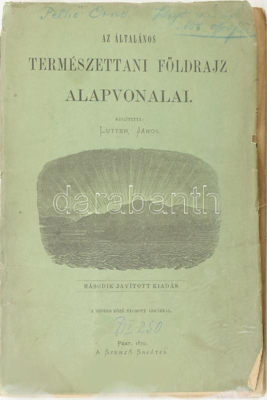 Lutter János: Az általános természettani földrajz alapvonalai. Pest, 1870., Szerzői. Második, javított kiadás. Szövegközti illusztrációkkal. Kiadói papírkötés, sérült, javított gerinccel, a borítón kis szakadással.