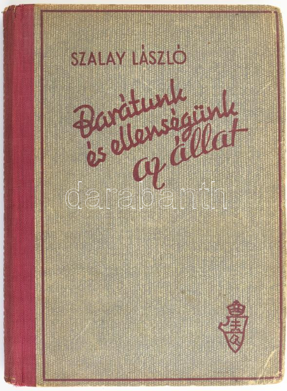 Szalay László: Barátunk és ellenségünk az állat. Bp., 1943, Kir. Magyar Egyetemi Nyomda. 251 + XLVIII p. Fekete-fehér képekkel illusztrált. Kiadói aranyozott gerincű félvászon-kötés, kopott borítóval, sérült gerinccel.