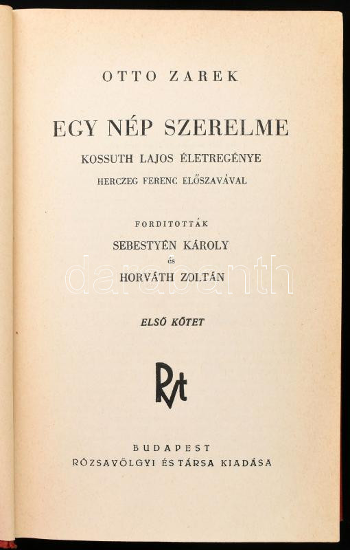 Otto Zarek: Egy nép szerelme. Kossuth Lajos életregénye. Herczeg Ferenc előszavával. Ford.: Sebestyén Károly és Horváth Zoltán. Bp.,én.,,Rózsavölgyi. Kiadói egészvászon-kötésben