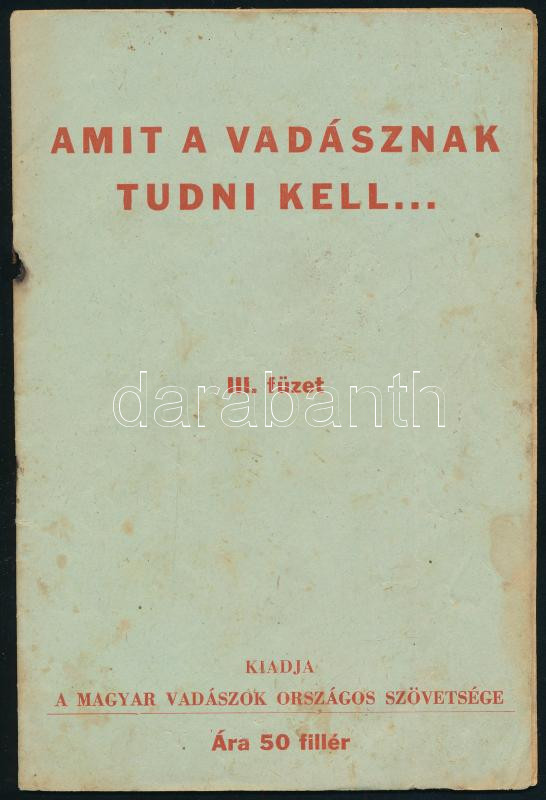 Leírás: Amit a vadásznak tudni kell... III. füzet. Bp., Magyar Vadászok Országos Szövetsége, foltos, megviselt állapotban, 16 p.