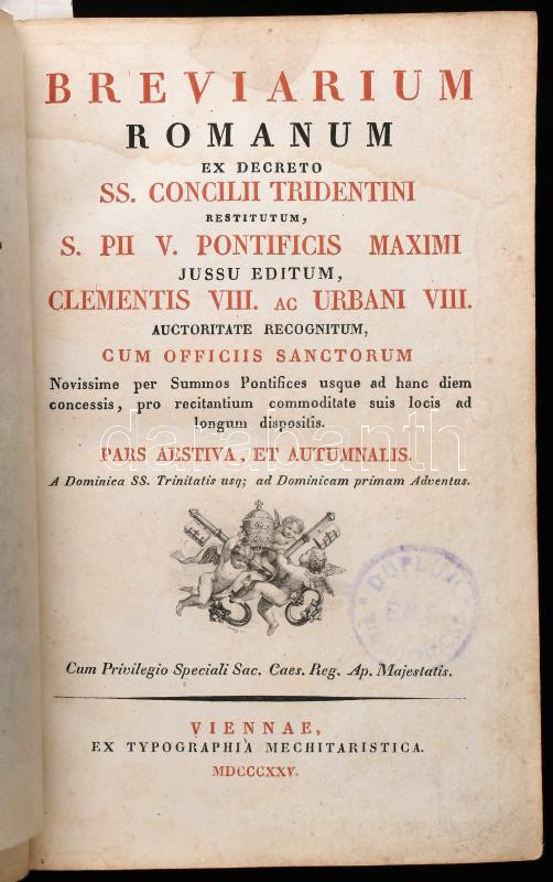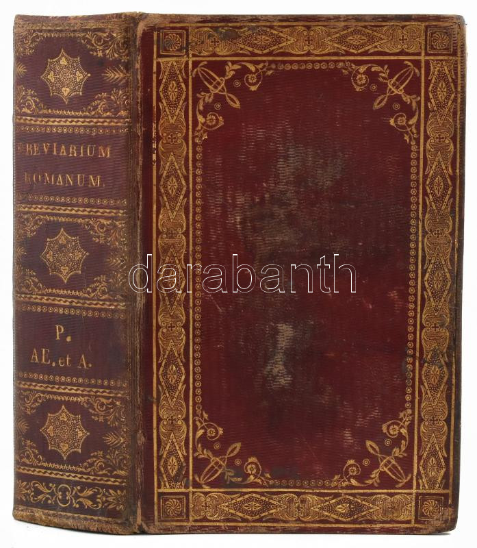 Leírás: Breviarium Romanum. Viennae, 1825. Ex typ. Mechitaristica. 3 könyomatos táblával Aranyozott egészbőr kötésben. Kötéstábla elvált a könyvtesttől