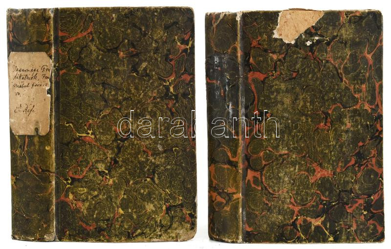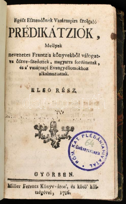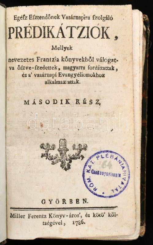 [Somogy Lipót (1748-1822)]: Egész esztendőnek vasárnapira szóló prédikátziók, mellyek nevezetes frantzia könyvekből válogatva öszve-szedettek, magyarra fordíttattak, és a' vasárnapi evangyéliomokhoz alkalmaztattak. Első és Második rész. Győr,1786., Miller Ferentz, 6+390; 8+520 p. Korabeli kartonált papírkötések, kopott borítókkal, régi intézményi bélyegzéssekkel, foltos lapszélekkel, a II. részben kissé sérült kötéssel, possessori névbejegyzésekkel, benne kézzel írt jegyzetlappal.