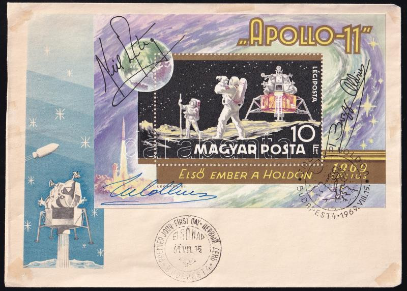 Neil Armstrong (1930-2012), Michael Collins (1930- ), Buzz Aldrin (1930- ) amerikai űrhajósok autográf aláírásai emlékborítékon /