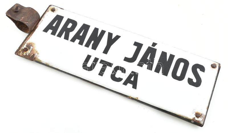 Arany János utca, régi zománcozott fém tábla, utcatábla, kétoldalas (eredetileg oszlopra rögzítve). Korának megfelelő zománcsérülésekkel, rozsdás állapotban, 40x15 cm