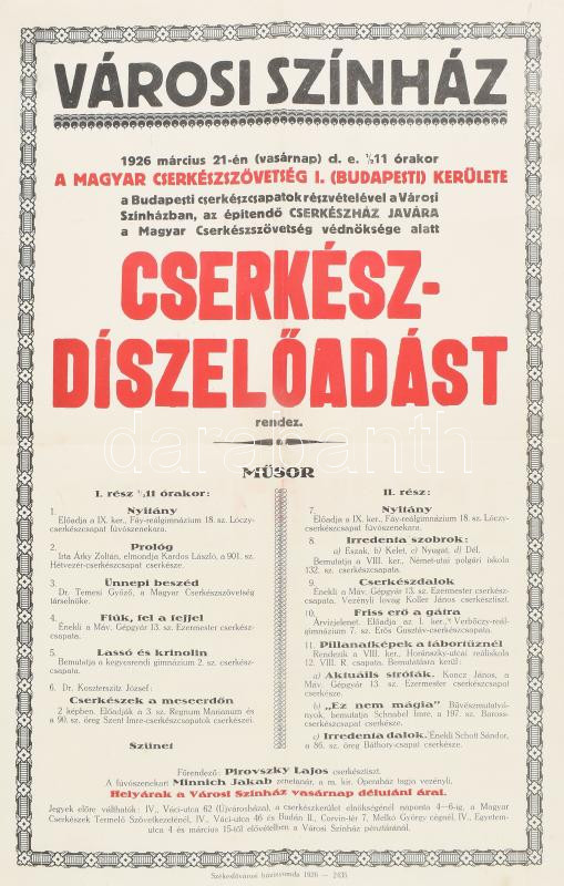 Leírás: 1926 A Magyar Cserkészszövetség budapesti kerülete cserkész díszelőadása a Városi Színházban, műsoros plakát, hajtva, jó állapotban, 31×48 cm