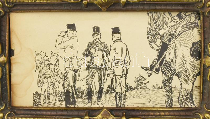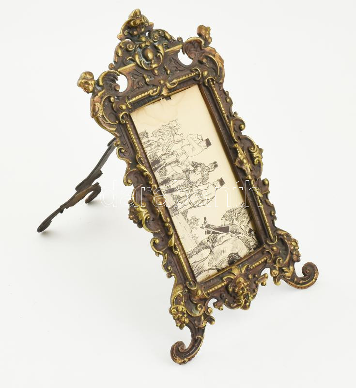 Rendkívül dekoratív, öntött bronz asztali képkeret, kitámasztható, hátoldalán nemesi koronás jelzéssel. Benne katonai témájú grafika. Teljes méret: 34x20 cm, látható: 18x9 cm