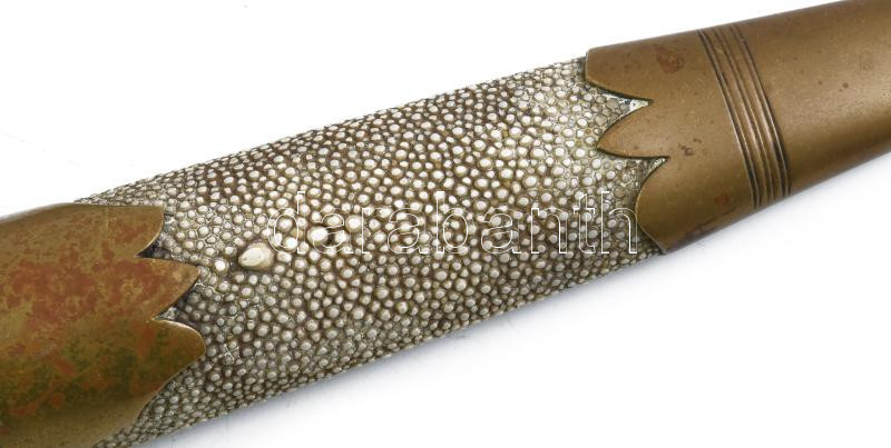 Leírás: Német vadásztőr, bronz, cápabőr, agancs nyél, szép állapotban, 1880-90 körül. h: 38 cm