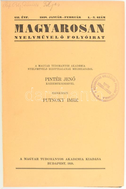 1938 Magyarosan. Nyelvművelő folyóirat VII. évf. 1-10 sz., és VIII. évf. 1-4. sz. Két teljes évfolyam! Szerk: Putnoky Imre, Pintér Jenő. Bp., MTA. Félvászon-kötésben, foltos, kissé kopott borítóval, bélyegzésekkel.